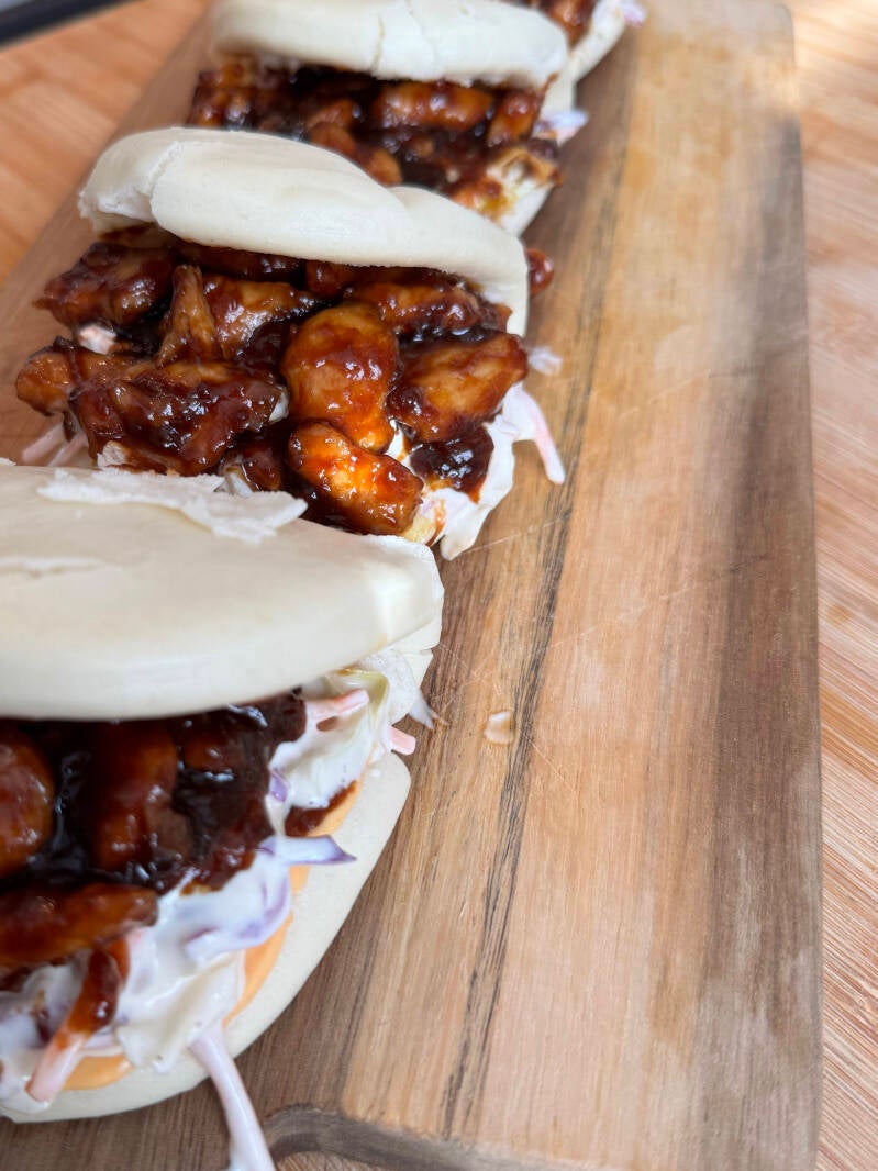 Ik heb bao buns van de toko uit de diepvries gebruikt.Dit gestoomd in een stoommandje. het broodje ingesmeerd met sriracha mayo, een beetje rauwkost er op en dan wat van je kipmengsel.