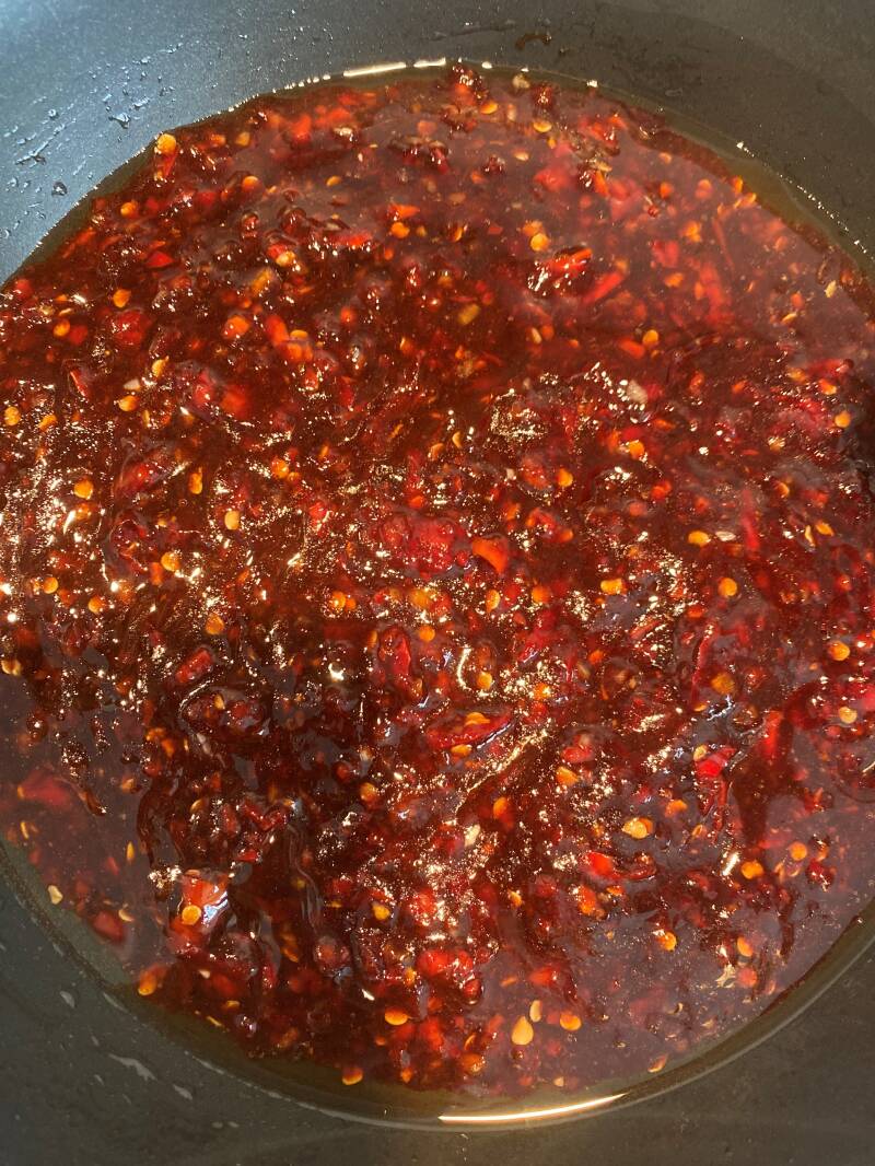 Giet nu een een beste scheut zonnebloem olie in de pan en bak de sambal basis tot het een beetje dikker wordt. Blijf de sambal de hele tijd door roeren in de pan. Meestal met 4 a 5 minuten heb je de gewenste dikte.